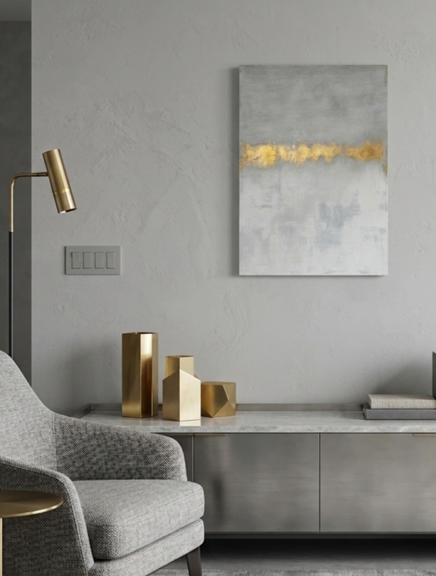 Transform your living space with this original, one-of-a-kind textured painting. Handcrafted on premium Italian canvas (50×70 cm), this artwork blends deep grey tones with airy white textures and gold leaf accents.