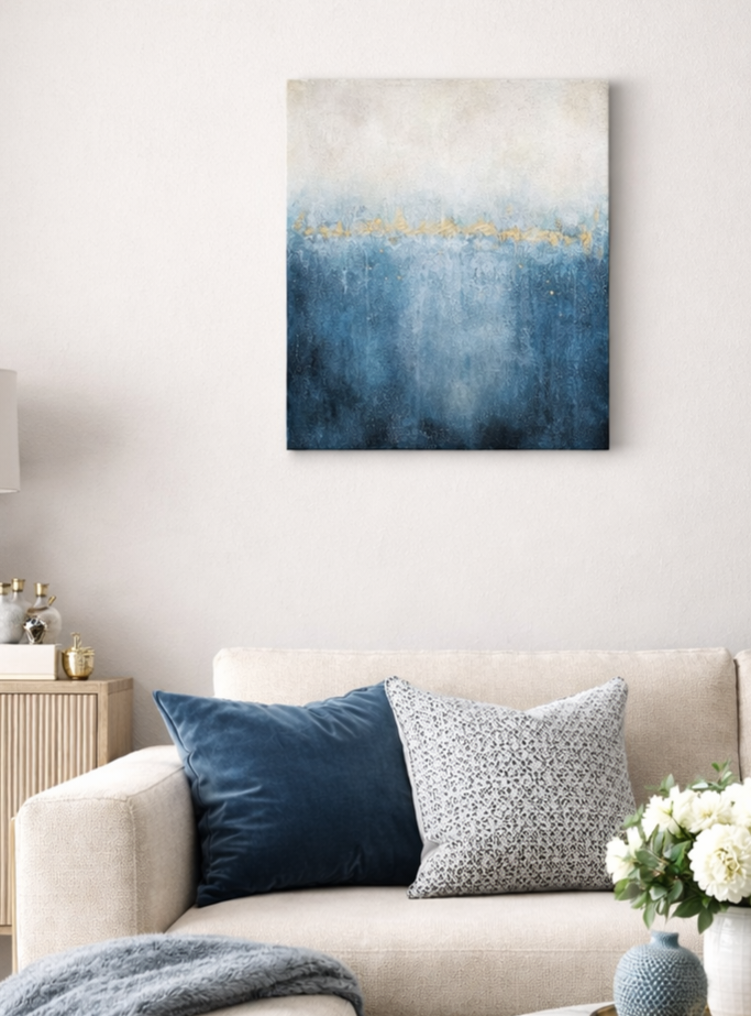 Explore the mystery of the deep with this original textured artwork titled “Beyond the Blue”. This one-of-a-kind 40×50 cm painting features a dramatic contrast between midnight blue depths and a bright, airy horizon, divided by a striking line of genuine gold leaf.