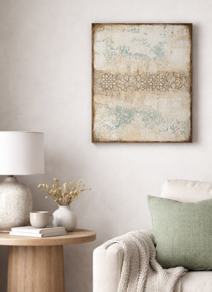 Beautifully detailed abstract painting with intricate mandala patterns. This piece combines a calm neutral palette with rich, touchable texture. Created on high-quality canvas, it’s a perfect statement piece for a boho or modern minimalist home.